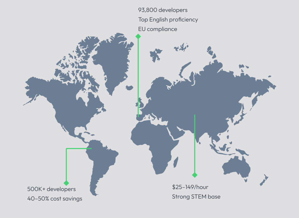 Eastern Europe provides similarly strong technical depth, with average hourly rates of $25-149 compared to Western European rates of $50-199. Poland, Ukraine, and Romania have become established hubs thanks to comprehensive STEM education systems and a reliable work ethic.