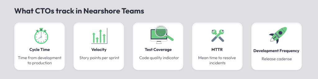 Top CTOs track nearshore teams with the same rigor they apply to internal teams. They measure cycle time, sprint velocity, defect trends, test coverage, and production incident rates. If nearshore performance doesn’t compare favorably to internal benchmarks, something needs to change.