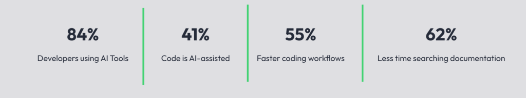 AI-enabled collaboration is becoming standard. Nearshore relationships increasingly rely on AI tools for code review, documentation generation, and QA to cut onboarding time and reduce handoff friction. The data is striking: 84% of developers already use or plan to use AI tools in their workflow according to Index.dev, with 82% using AI coding assistants daily or weekly per Second Talent research. In 2025, 41% of all code is AI-generated or AI-assisted according to GitHub’s Octoverse and Netcorp analysis, representing a fundamental shift in how software gets built.
